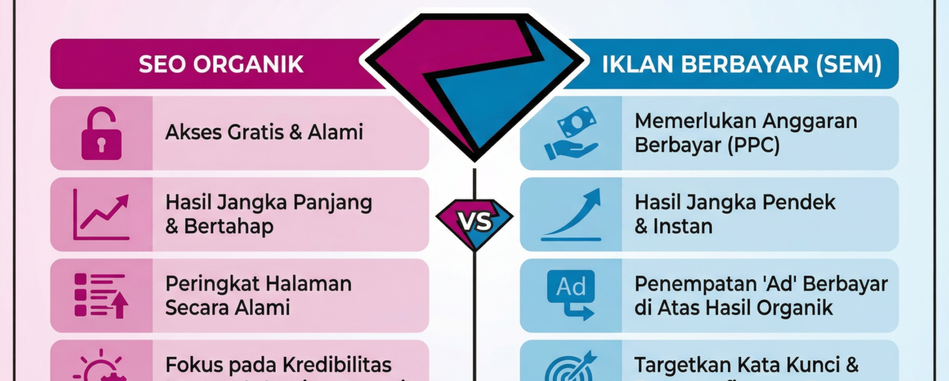Kedua strategi ini memiliki tujuan yang sama, yaitu mendatangkan pengunjung ke website Anda. Namun, cara kerja, biaya, dan hasil yang Anda dapatkan sangatlah berbeda. Mari kita bedah satu per satu agar Anda tidak salah langkah dalam mengalokasikan anggaran pemasaran Anda.